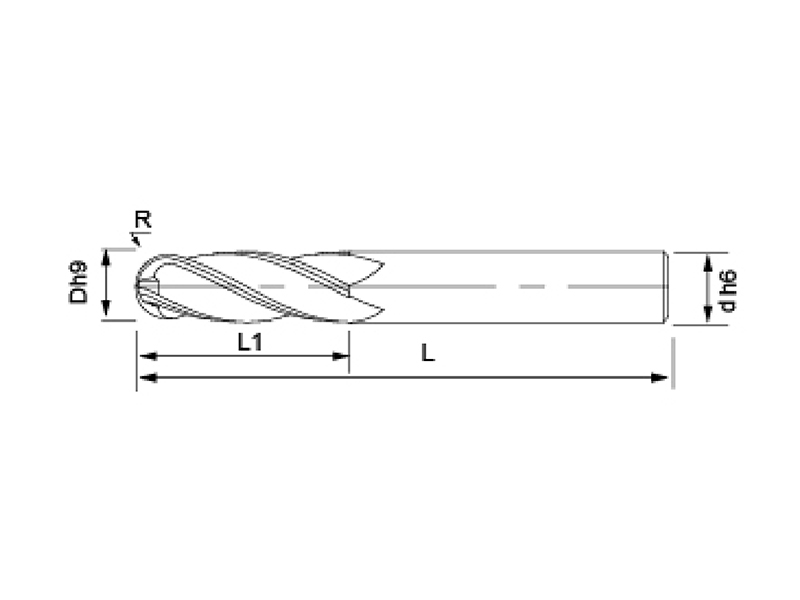 | 刃徑(D h9) | 球頭半徑 | 刃長(L1) | 柄徑(d h6) | 全長(L) | 刃數(Z) | 避空直徑 | 有效長 |