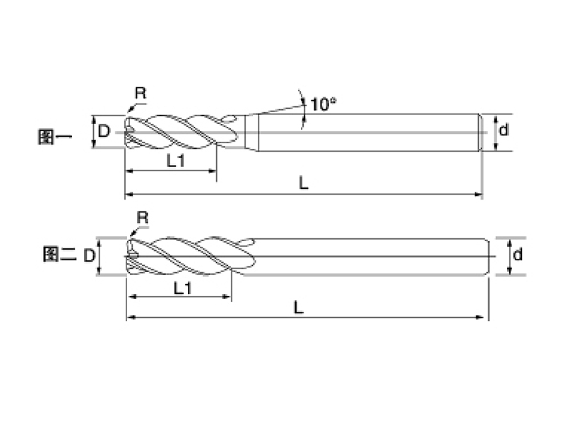 | 刃徑 (D h9) | 刃長 (L1) | 柄徑 (d h6) | 全長(L) | 刃數(Z) | 刀尖 | 避空直徑 | 有效長 |