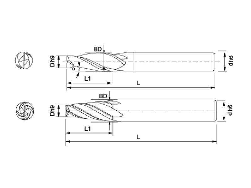 | 產品編號 ltem code | 先端徑(D h9) | 斜度(α°) | 刃長(L1) | 粗端徑(BD) | 柄徑(d h6) | 全長(L) |